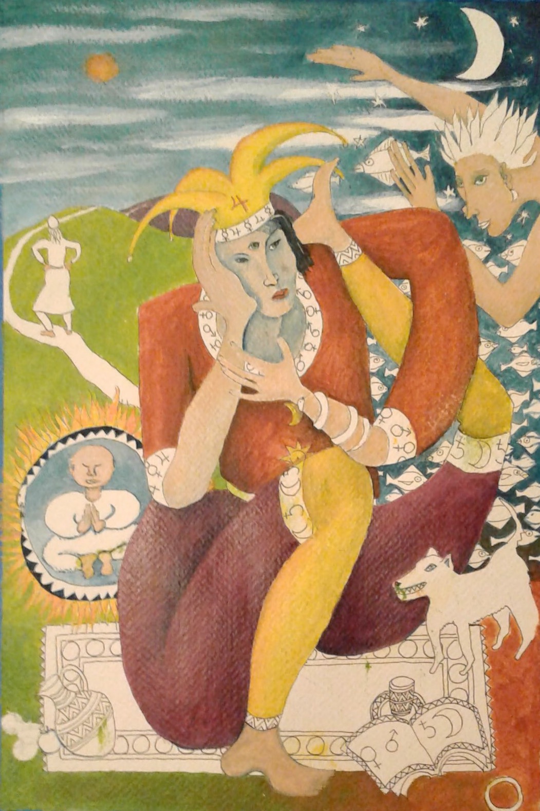 So tonight I really went at it. I definitely am combining symbols from astrology and the tarot as well as other sources, including symbols I like using in my work. I have decided to throw out objective reality and combine realities to create a feeling of the inner and outer planes of existence–which of course really befits the Fool.