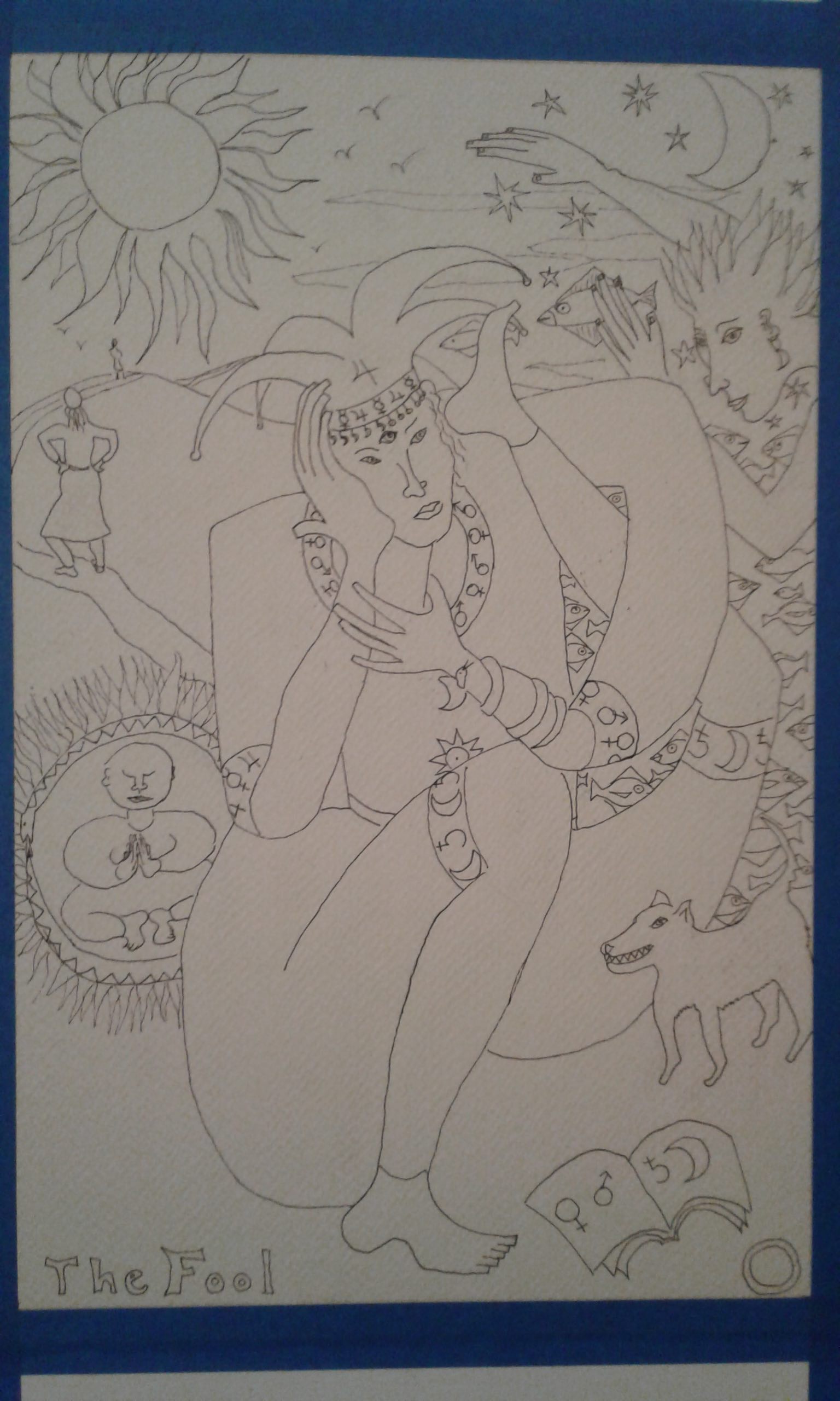 I got rid of the huge sun since it was too busy and took away from the impact of the Fool. Its still there, but not overpowering everything else. Color always changes everything, IMHO. I have to be and am willing to simplify as compared to a line drawing.