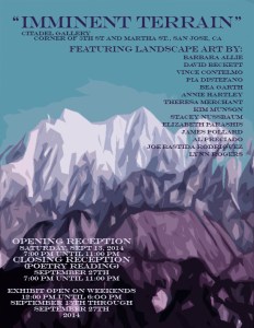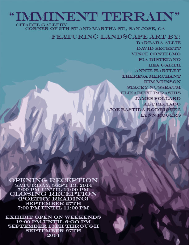 “Imminent Terrain” exhibit poster, with featured artists, Sept. 13 through Sept. 27, 2014 “Imminent Terrain” exhibit: