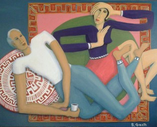 “Discovering Joy,” by Bea Garth copyright 2017 acrylic on canvas 20 x 26 in. $1200.00The Music Genie by Bea Garth copyright 2018 acrylic on canvas 30 x 30 $2000.00“Legs Like Vines” by Bea Garth, copyright 2017 acrylic on canvas 24 x 30 $1800.00Perspective by Bea Garth copyright 2014 acrylic on canvas 24 x 24 $900.00